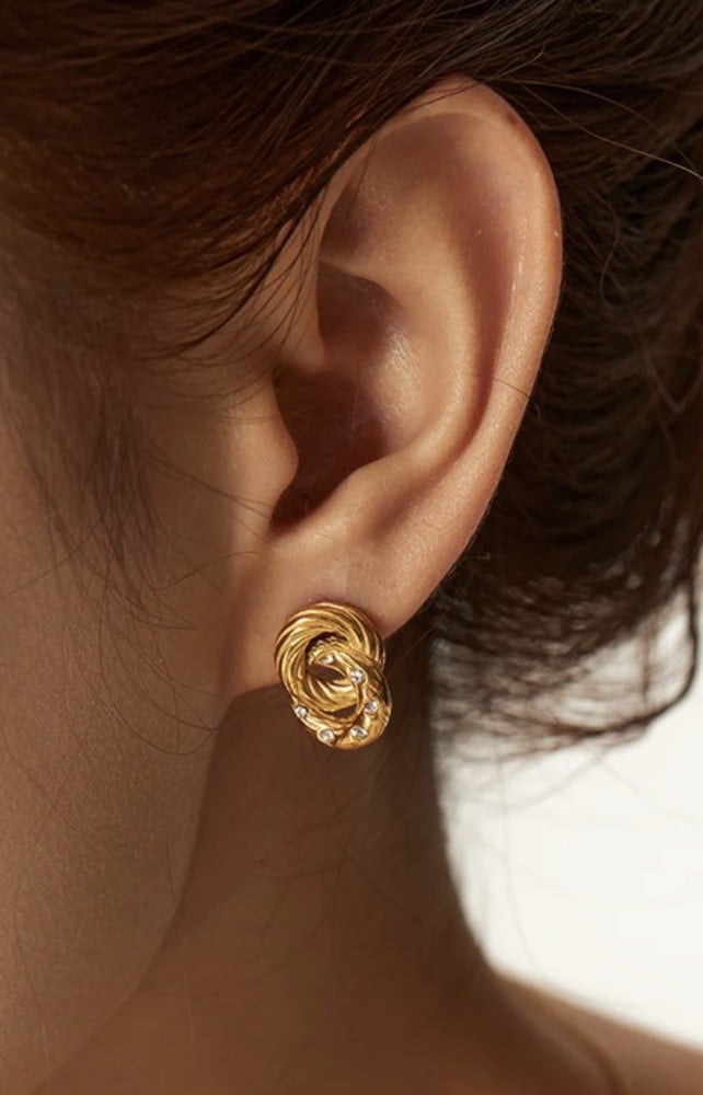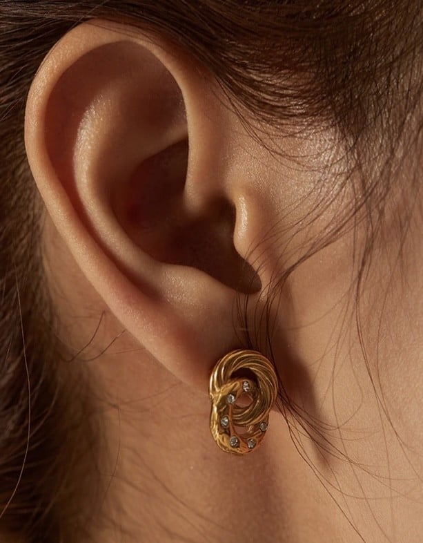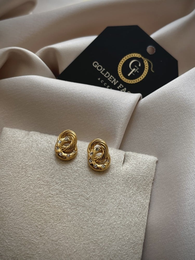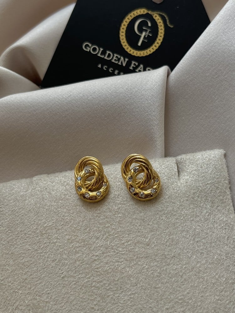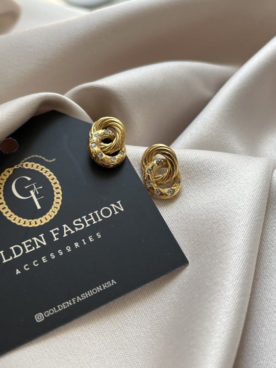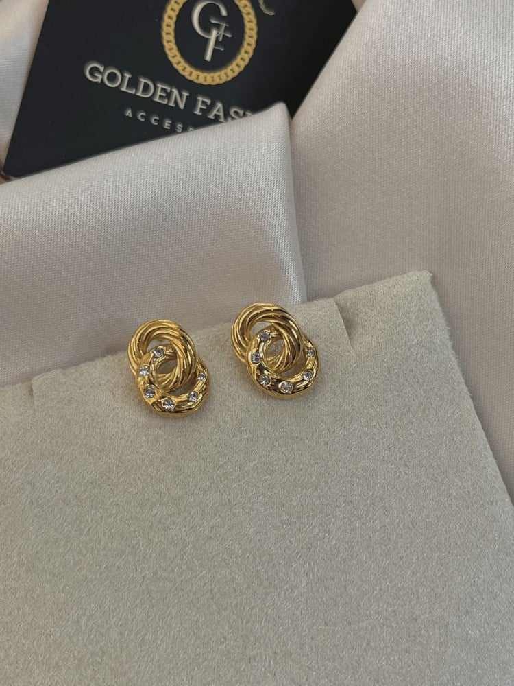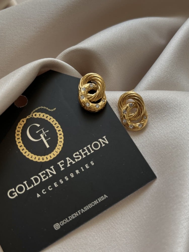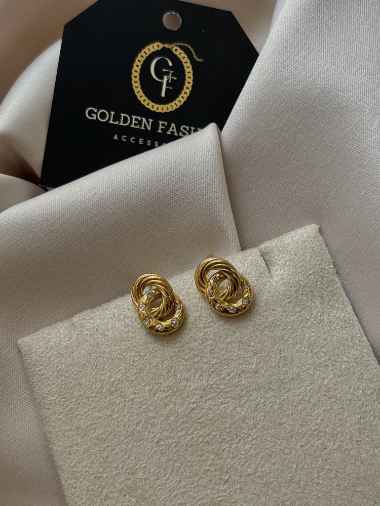 حلق دائرتين مزين بالزريكون مصنوع من المعدن المقاوم للصدأ و الماء ومطلي ذهب 18K (PVD) وهذا يعني يستمر اللون لفترة طويلة حسب إستخدامك